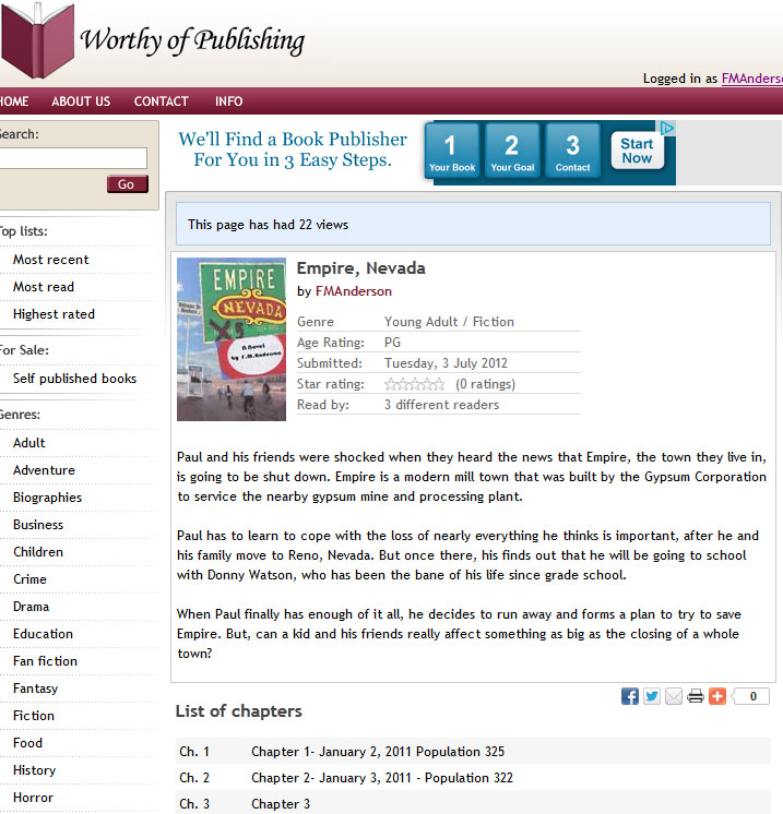 I’m now sharing the first three chapters of my book at Worthy of Publishing. Please take a second to read it and offer any critiques.