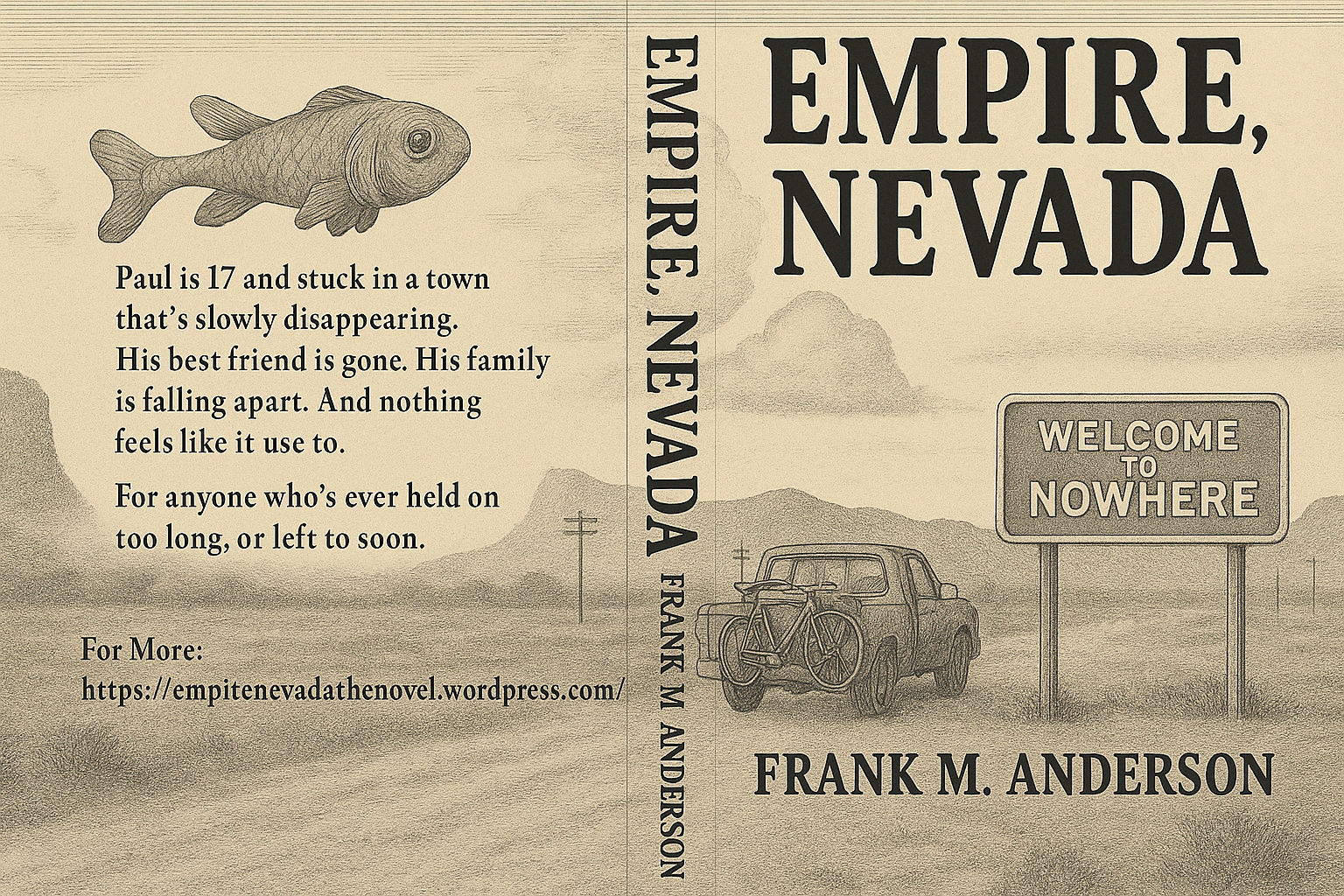 I didn’t want something generic. I wanted the cover to feel like the book — lonely, strange, nostalgic, and a little haunted. It started with a rough concept: a desert town vanishing into memory, a road that led nowhere, a truck with bikes strapped to the back, and a koi-shaped cloud drifting across the sky. We went through multiple color versions, fonts, and visual styles before I realized what it really needed: black-and-white. Textured. Detailed. Etched into time.