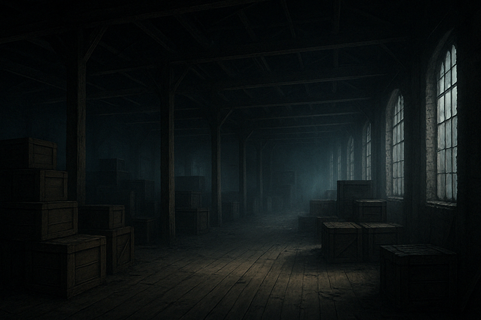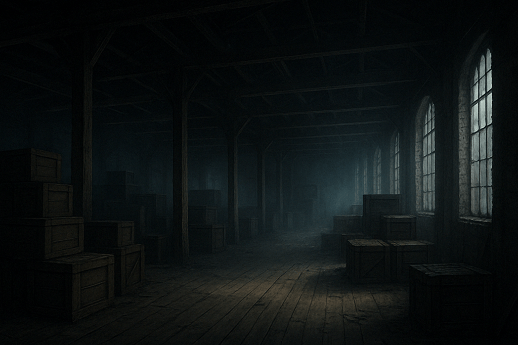 Stacks of crates filled with memories no one wants. Labels blur as you look at them. The dust here isn’t natural—it’s narrative residue.
