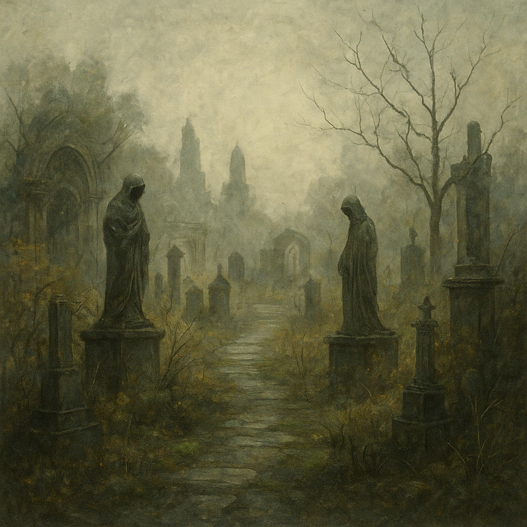 There is no path here, but people walk it. Statues without faces. Flowers that make no scent. The wind carries voices from someone you meant to remember.