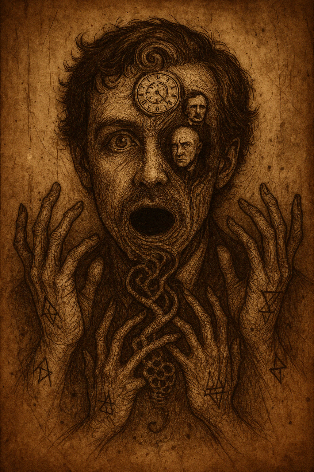 But the ink bled backward. The page began to hiss. The outline twisted itself into recursion—eyes within eyes within mouths. My hand became a fractal, and the face I drew kept shifting. One moment it looked like me. The next, like every veiled entity I’ve ever sketched. The forehead cracked open like an egg and spilled miniature clocks. The mouth became a mirror that reflected the viewer’s worst moment. And the hands—there were too many hands.
