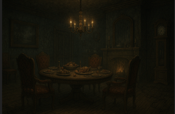 A table set for more guests than are present. Forks bend to memory. Wine pours from bottles never opened. Frank sat across from Clara. The Boy passed the salt, but his hand was a candle.